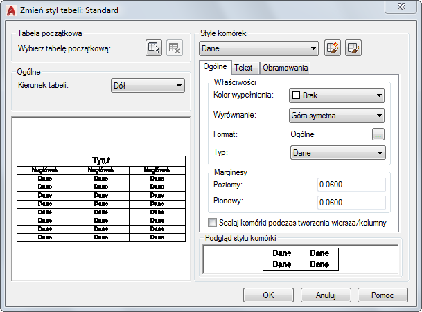 Umożliwia określenie tabeli w rysunku, która zostanie użyta jako przykład formatowania danego stylu tabeli. Gdy tabela zostanie wybrana, będzie można określić strukturę i zawartość, która ma być skopiowana z tabeli do stylu tabeli.