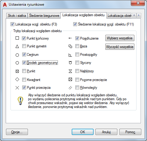 W ustawieniach trybów lokalizacji względem obiektu, nazywanych także „running osnaps”, można określić punkt w dokładnej lokalizacji w obiekcie. Naciskając klawisz TAB, można przejrzeć dostępne opcje.
