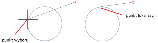 Lokalizuje do najbliższego punktu na obiekcie takim jak łuk, okrąg, elipsa, łuk eliptyczny, linia, punkt, polilinia, półprosta, splajn lub prosta.