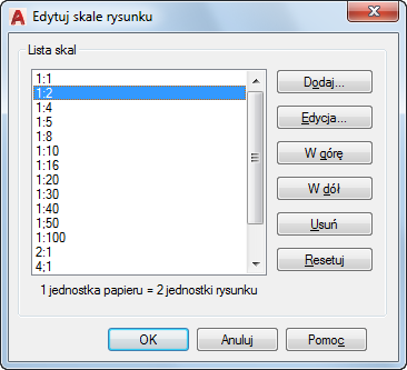 Steruje listą skal dostępnych w przypadku rzutni układu, układów stron i drukowania.