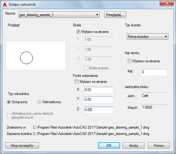 Umożliwia wybranie pełnej (bezwzględnej) ścieżki, ścieżki względnej do pliku odnośnika lub braku ścieżki; nazwa odnośnika (plik musi znajdować się w tym samym folderze co bieżący plik rysunku).