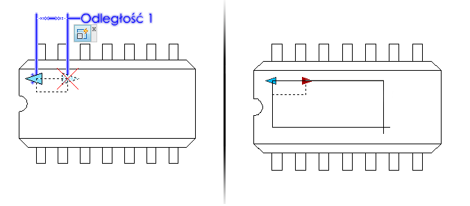 Operacja skalowania zastosowana względem parametru biegunowego powoduje przeskalowanie wybranych obiektów według określonych odległości i kąta. Wprawdzie zachowanie wynikowej geometrii będzie takie same, jak przy operacji skalowania zastosowanej względem parametru liniowego, ale sposób manipulowania uchwytami w palecie Właściwości będzie inny.