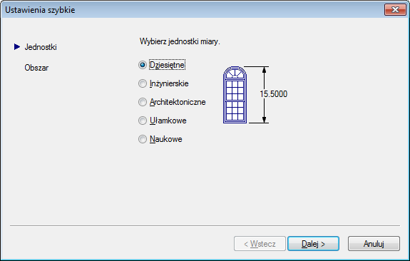 Kreator Ustawienia zaawansowane zawiera pięć stron: Jednostki, Kąt, Kierunek kąta, Zwrot kąta i Obszar. Pracując z kreatorem, można naciskać przyciski Wstecz i Dalej, aby przełączać się między stronami; na ostatniej stronie należy nacisnąć przycisk Zakończ, aby zamknąć kreatora i utworzyć nowy rysunek z podanymi ustawieniami.