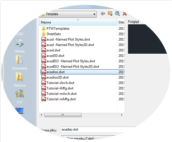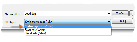 Aby zmodyfikować istniejący plik szablonu rysunku, kliknij przycisk Otwórz, określ typ pliku Szablon rysunku (*.dwt) w oknie dialogowym Wybierz plik i wybierz plik szablonu.