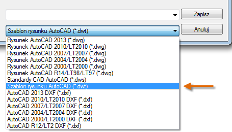 Każdy plik rysunku (.dwg) można zapisać jako plik szablonu rysunku (.dwt). Można również otworzyć dowolny istniejący plik szablonu rysunku, zmodyfikować go, a następnie zapisać go, w razie potrzeby pod inną nazwą.