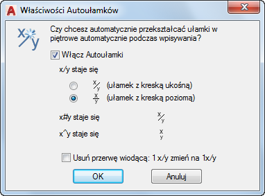 Ustawia domyślnie automatyczne przedstawianie znaków w postaci ułamków.