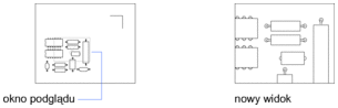 Umożliwia przesunięcie widoku i zmianę jego powiększenia z zastosowaniem prostokątnego okna widoku. Ramka widoku reprezentuje widok, który można zmniejszać lub powiększać i przesuwać po rysunku. Zmiana położenia i rozmiaru okienka widoku umożliwia wypełnienie rzutni widokiem wewnątrz okienka widoku. Niedostępne w rzutowaniu perspektywicznym.