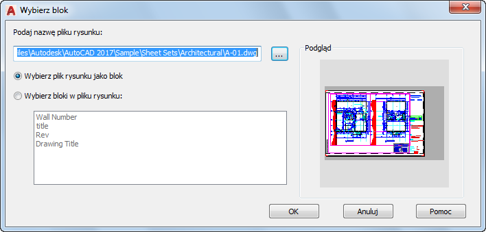 Wykorzystuje cały wybrany plik rysunku lub plik szablonu rysunku jako definicję bloku.