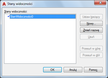 Ustawia wybrany stan widoczności jako bieżący stan do wyświetlenia w Edytorze bloku. Nie zmienia domyślnego stanu widoczności, który jest wyświetlany podczas wstawiania bloku do rysunku, ani nie zmienia wyświetlanego stanu widoczności odniesień do bloków, które są już wstawione i edytowane w rysunku.