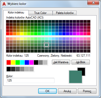 Można wybrać kolor spośród 255 kolorów z indeksu AutoCAD (ACI), kolorów True Color i kolorów palety kolorów, dostępnych na trzech kartach.