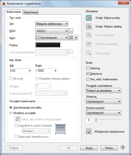Okno dialogowe Kreskowanie i wypełnienie jest wyposażone w dwie karty i kilka wspólnych opcji dostępnych na obu kartach.