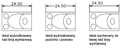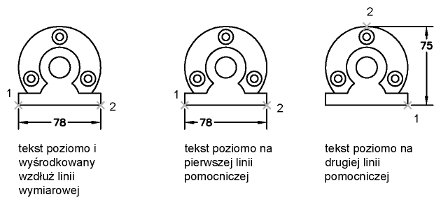 Pozycja tekstu wzdłuż linii wymiarowych w stosunku do pomocniczych linii wymiarowych jest nazywana położeniem tekstu. Aby samemu umieścić tekst podczas tworzenia wymiaru, należy użyć opcji Wstaw tekst ręcznie znajdującej się w oknie dialogowym Modyfikuj/Nowy styl wymiarowania na karcie Dopasowanie. Aby automatycznie umieścić tekst na środku linii wymiarowania, na pomocniczej linii wymiarowej lub nad nią należy użyć opcji położenia tekstu.