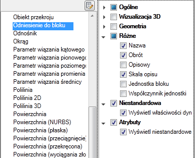 Gdy zaznaczone są kategorie Niestandardowe i Atrybuty, na palecie Szybkie właściwości są wyświetlane dynamiczne właściwości i atrybuty bloku.