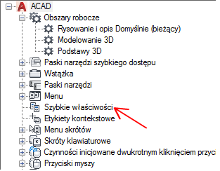Jeśli typ obiektu jest zaznaczony, właściwości tego typu obiektu są wyświetlane na palecie Szybkie właściwości, gdy: wybrany jest obiekt tego samego typu, w zmiennej systemowej QPMODE ustawiona jest wartość 2 i włączona jest zmienna systemowa PICKFIRST. Usuń znacznik znajdujący się obok typu obiektu, aby usunąć wybrany typ obiektu z palety Szybkie właściwości.