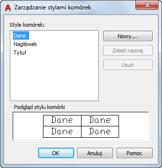 Wyświetla listę wszystkich stylów komórek zawartych w bieżącym stylu tabeli. Style komórek Tytuł, Nagłówek i Dane są zawsze zawarte w każdym stylu tabeli.