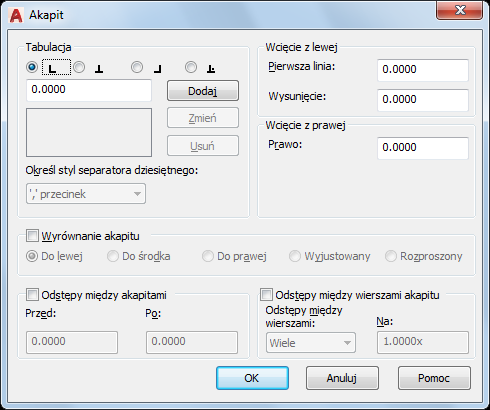 Wyświetla opcje ustawienia tabulatorów, łącznie z ich dodawaniem i usuwaniem. Opcje pozwalają na ustawianie tabulatora: lewego, środkowego, prawego i dziesiętnego. Tabulatory można również ustawiać za pomocą przycisku wyboru tabulatora na linijce lokalnego edytora tekstu.