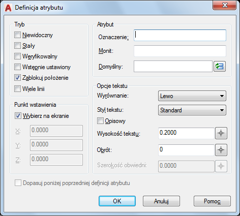 Określa położenie atrybutu. Podaj wartości współrzędnych lub wybierz opcję Określ na ekranie i określ urządzeniem wskazującym położenie atrybutu względem innych obiektów.