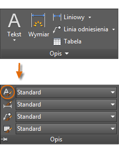 Podobnie jak w przypadku innych elementów opisowych tekst wielowierszowy oferuje dużą liczbę ustawień. Te ustawienia można zapisać za pomocą polecenia STYL jako stylu tekstu. Dostęp do stylów tekstu można uzyskać, klikając strzałkę rozwijaną na panelu Opis. Bieżący styl tekstu jest wyświetlany u góry listy rozwijanej.