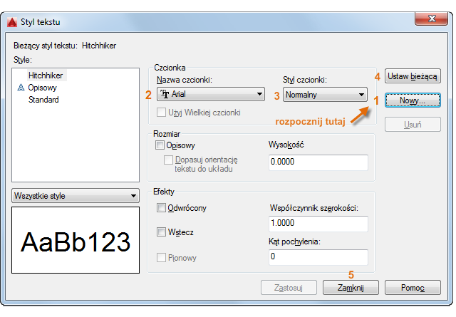 Podczas tworzenia nowego stylu tekstu należy najpierw nadać mu nazwę, a następnie wybrać czcionkę i jej styl. Kolejność klikania przycisków pokazano poniżej.