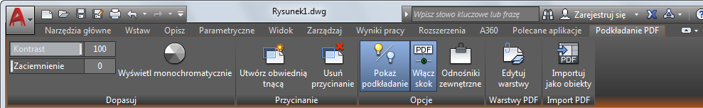 Po wybraniu podkładania PDF na wstążce zostanie wyświetlona karta kontekstowa PDF.