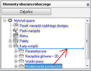 1. Na karcie Dostosuj, na panelu Dostosowywane pliki: <nazwa pliku> kliknij znak plusa (+) obok węzła Obszary robocze, aby go rozwinąć.