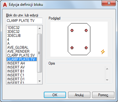 Wyświetla podgląd wybranej definicji bloku. Ikona błyskawicy wskazuje, że jest to definicja bloku dynamicznego.