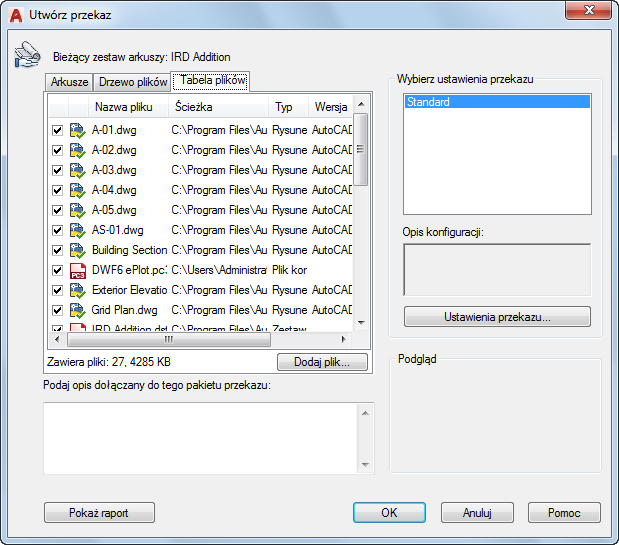 Domyślnie wyświetlane są wszystkie pliki skojarzone z bieżącym rysunkiem (zależne odnośniki zewnętrzne, style wydruku i czcionki). Możesz dodać pliki do pakietu przekazu lub usunąć z niego pliki istniejące. Pliki skojarzone przez URL nie są umieszczane w zbiorze przekazu.