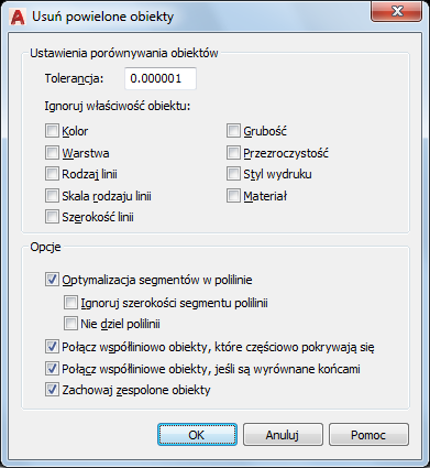 Po wybraniu tej opcji sprawdzane będą poszczególne segmenty linii i łuku w wybranych poliliniach. Powielone wierzchołki i segmenty zostaną usunięte.
