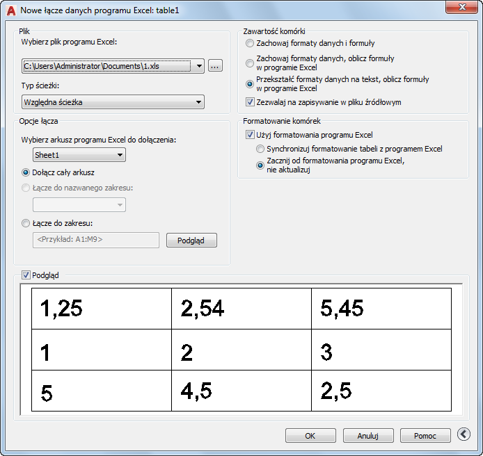Importuje do rysunku formatowanie określone w oryginalnym pliki XLS, XLSX lub CSV, ale zmiany formatowania nie są uwzględniane w przypadku użycia polecenia AKTUALŁĄCZEDANYCH.