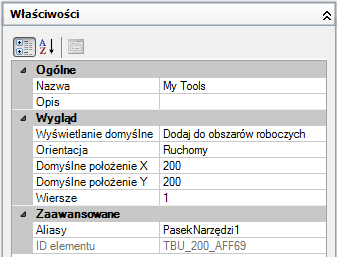 Uwaga: Zmiany wprowadzone tutaj we właściwościach paska narzędzi mają wpływ tylko na początkowy wygląd paska narzędzi po wczytaniu pliku adaptacji (CUIx). Zaleca się kontrolowanie wyglądu paska narzędzi za pomocą obszaru roboczego.