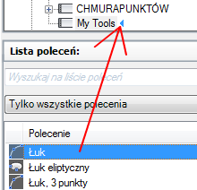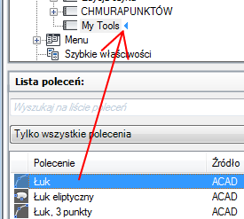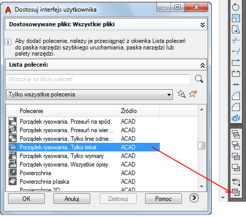 4. Na panelu Lista poleceń przeciągnij polecenie, które chcesz dodać, do paska narzędzi na panelu Dostosowywane pliki: <nazwa pliku>.