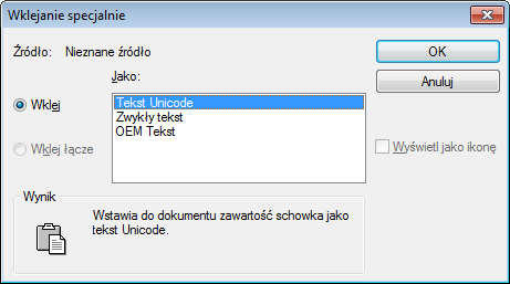 Wstawia obrazek ikony aplikacji zamiast danych. Aby zobaczyć lub zmodyfikować dane, należy dwukrotnie kliknąć ikonę.