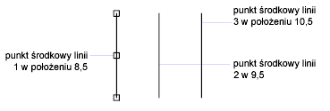Przytrzymanie wciśniętego klawisza Ctrl podczas wybierania punktów wielu kopii za pomocą urządzenia wskazującego powoduje, że wskaźnik graficzny będzie przyciągany do punktu odsunięcia w oparciu o dwa ostatnio wybrane punkty. Na poniższej ilustracji punkt symetrii linii 1 ma współrzędne 8,5. Linia 2 została skopiowana w trybie rozciągania przy naciśniętym klawiszu Ctrl w oparciu o ten punkt symetrii. Jej punkt symetrii ma współrzędne 9,5. W oparciu o to odsunięcie trzecia linia zajmie położenie wyznaczone współrzędnymi 10,5.