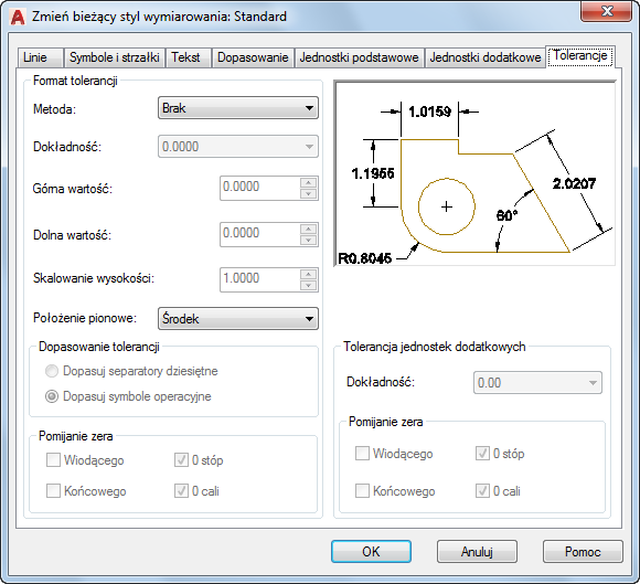 Steruje pomijaniem zer wiodących i kończących oraz wymiarów w stopach i calach mających wartość zero. (DIMTZIN — zmienna systemowa)