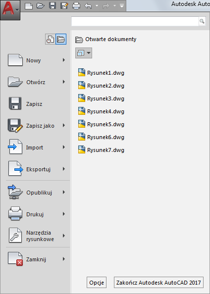 Otwarte dokumenty są wyświetlane na liście Otwarte dokumenty, ostatnio otwarty plik znajduje się na początku listy. Wybierz nazwę dokumentu, aby go uaktywnić.