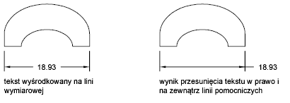Można przenosić tekst wymiarowy w lewo, w prawo lub do środka linii wymiarowej lub do dowolnego położenia wewnątrz lub na zewnątrz linii pomocniczych. Szybką i prostą metodą dokonania tego jest wykorzystanie uchwytów. Jeżeli tekst jest przenoszony w górę lub w dół, bieżące dopasowanie pionowe tekstu względem linii wymiarowej nie zmienia się, dzięki czemu linie wymiarowe i linie pomocnicze są odpowiednio zmieniane. Rysunek pokazuje wyniki przeniesienia tekstu do dołu i w prawo. Tekst pozostaje wyśrodkowany pionowo w stosunku do linii wymiarowej.