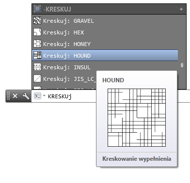 Przykład: chcesz wstawić wzór kreskowania. Po wprowadzeniu polecenia kreskuj w wierszu polecenia i naciśnięciu klawisza Tab, aby przełączać opcje, lista propozycji wiersza polecenia zostanie rozwinięta, aby uwzględniała dostępne wzory kreskowania. Przeciągnij pasek przewijania, aby wyświetlić dodatkowe kreskowania i gradienty. Można wyświetlić miniaturę każdej opcji, umieszczając kursor na nazwie.