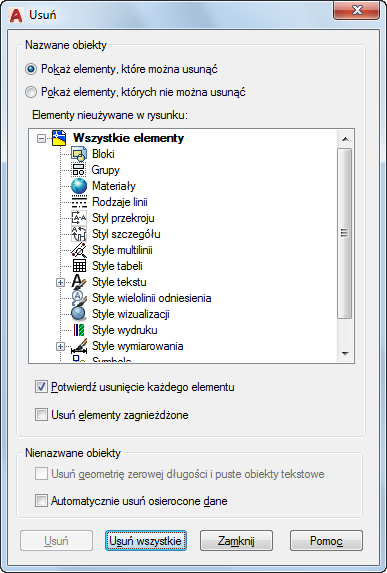 Większość tych obiektów jest w danej chwili używana na rysunku lub jest domyślnym elementem, który nie może być usunięty.