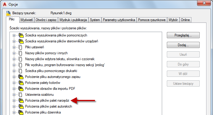 Pliki palet narzędzi zawierają narzędzia standardowe i zdefiniowane przez użytkownika. Te pliki są przechowywane w położeniach określonych ustawieniem Położenia plików palet narzędzi.