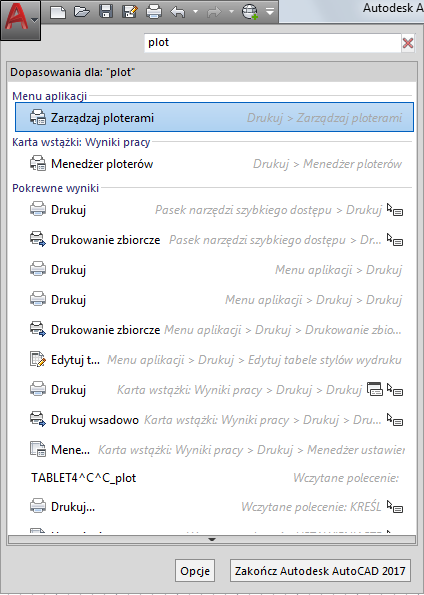 Pole wyszukiwania poleceń jest wyświetlane na górze menu aplikacji. Wyniki wyszukiwania mogą zawierać polecenia menu, podstawowe etykiety narzędzi i ciągi tekstowe wiersza polecenia. Można wprowadzić dowolny wyszukiwany termin w dowolnym języku. Wyniki można zastosować do bieżącego obszaru roboczego.