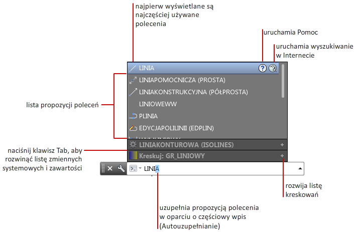 - Lista propozycji zawiera polecenia, które zawierają wpisywane znaki, a także polecenia, które się od nich rozpoczynają.