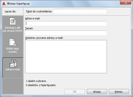 Tworzy listę ostatnio używanych adresów poczty elektronicznej, z których można wybrać jeden dla hiperłącza.