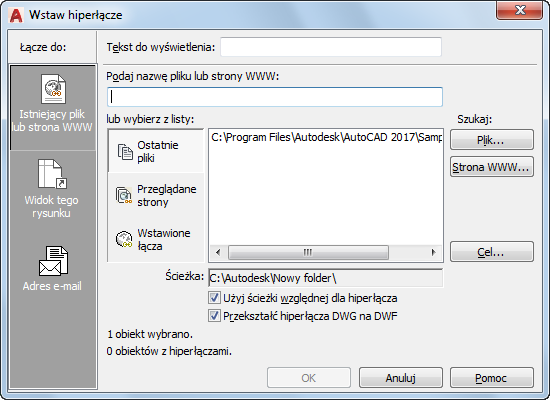 Wyświetla ścieżkę do pliku skojarzonego z hiperłączem. Jeśli wybrano opcję Użyj ścieżki względnej dla hiperłącza, na liście pojawia się tylko nazwa pliku. Jeżeli nie wybrano opcji Użyj ścieżki względnej dla hiperłącza, wyświetlana jest pełna ścieżka oraz nazwa pliku.