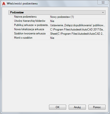 Określa plik szablonu rysunku (DWT) i nazwę układu, który zostanie użyty do tworzenia nowych plików rysunków dla tego podzestawu.