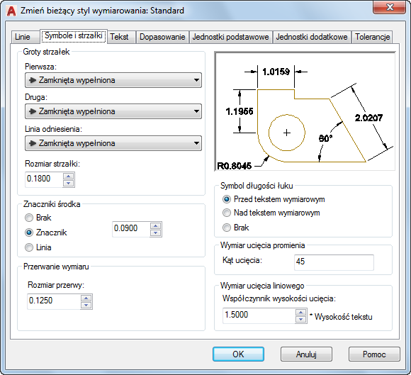 Ustala sposób wyświetlania symbolu długości łuku na wymiarze długości łuku. (DIMARCSYM — zmienna systemowa)