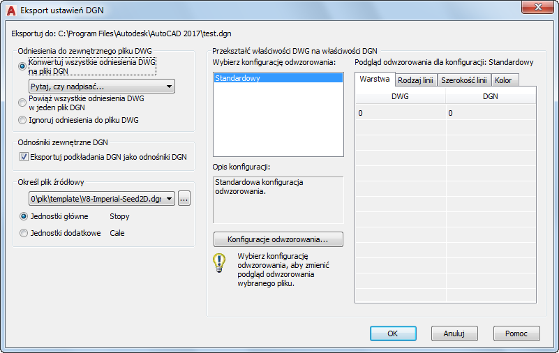 Wyświetla listę wszystkich właściwości eksportowanego pliku DWG (w kolumnie DWG) i wybranej konfiguracji odwzorowania (w kolumnie DGN).