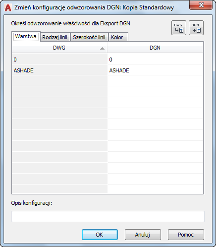Eksport konfiguracji odwzorowania: Jeśli dostęp do okna dialogowego Zmień konfigurację odwzorowania DGN uzyskano przez utworzenie nowej konfiguracji w oknie dialogowym Eksport ustawień DGN, kolumna DWG zawiera wszystkie zdefiniowane rodzaje linii w bieżącym pliku rysunku. Zawsze gdy docelowa komórka jest pusta (kolumna z prawej strony), będzie używane domyślne odwzorowanie systemowe.