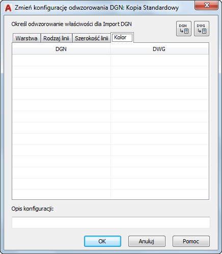 Import konfiguracji odwzorowania: jeśli dostęp do okna dialogowego Zmień konfigurację odwzorowania DGN uzyskano przez utworzenie nowej konfiguracji w oknie dialogowym Import ustawień DGN, kolumna DGN zawiera wszystkie zdefiniowane style linii w zaimportowanym pliku DGN oraz plik źródłowy DGN używany podczas tworzenia pliku DGN.