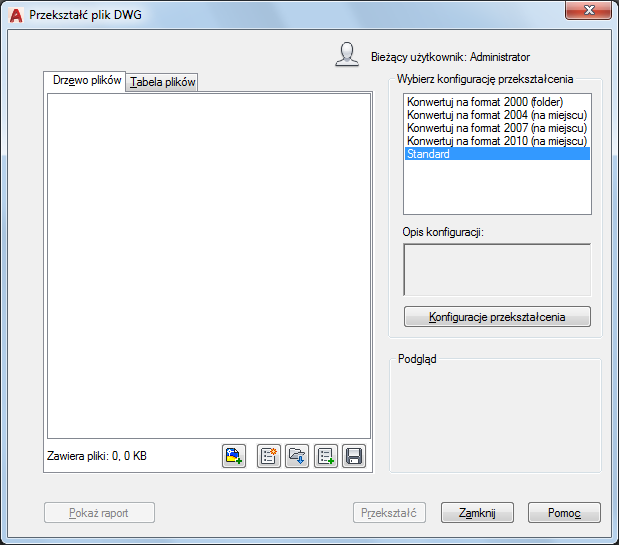 Otwiera standardowe okno dialogowe wyboru plików, w którym można wybrać pliki rysunków w celu dodania do listy konwersji. Przycisk ten jest dostępny na obu kartach, Drzewo plików i Tabela plików.