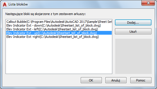 To okno dialogowe jest wyświetlane po kliknięciu przycisku Dodaj bloki w oknie dialogowym Kategoria widoku lub po kliknięciu przycisku [...] obok opcji Bloki objaśnień w oknie dialogowym Właściwości zestawu arkuszy.